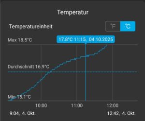 Da der Wagen weiterhin nicht fertig ist, hatte ich anfangs etwas Bedenken, ob ich die vorhergesagten kalten Nächte (teilweise bis 5°C) überstehe. Darum hatte ich mir noch einen einfachen Heizlüfter mit Thermostat (Amazon Link: https://amzn.to/3KKORmQ – Als Amazon-Partner verdiene ich an qualifizierten Einkäufen) besorgt – „für alle Fälle“. Nach einigen regnerischen Spaziergängen war der zum Aufwärmen aber auch notwendig. Konnte damit den Wagen auf immerhin knapp 19° bringen, was angesichts der Außentemperaturen um die 15° schon sehr angenehm war. Ich denke, dass die zusätzliche Dämmerung am Dach, die seit dem ersten Ausflug (Die Erste Tour: 5 Übernachtungen in Dinslaken) hinzugekommen ist, durchaus auch viel ausgemacht hat.