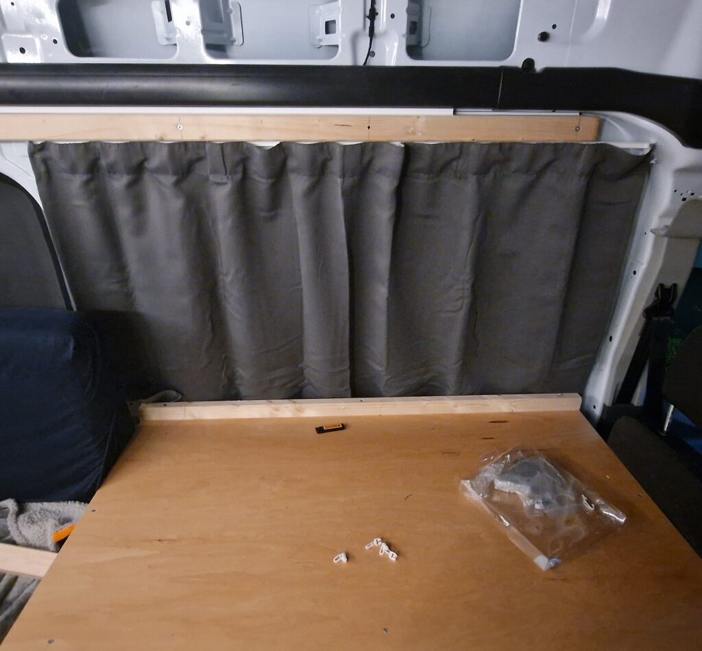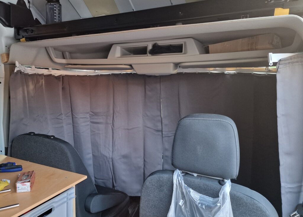 100%ig zufrieden bin ich nur mit dem Seitenfenster. Die Heck-Vorhänge sind etwas „knapp“ geworden – da wird es mittelfristig wohl nochmal ein paar größere geben. Die Konstruktion mit der flexiblen Schiene an der Frontscheibe, finde ich etwas zu „wackelig“ – mal sehen, was die Praxis zeigt. Das Auto kann jetzt auf jeden Fall komfortabel per Vorhang abgedunkelt werden 🙂