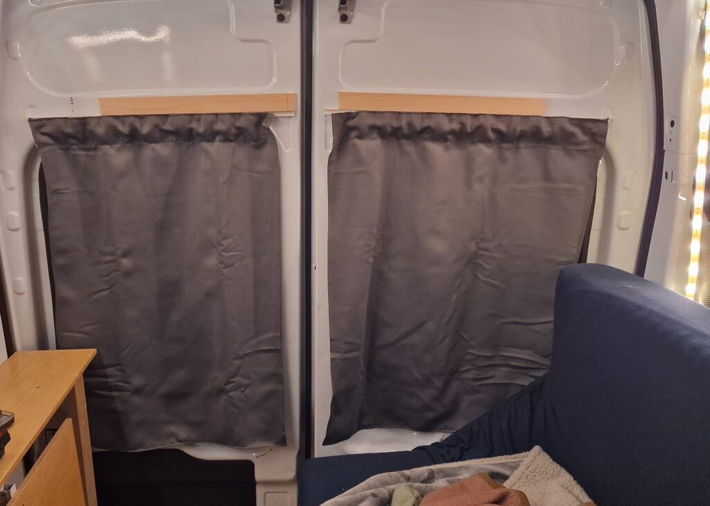 Privatsphäre hört sich auch „schlicht“ an – war dann aber mehr Arbeit als erwartet. Da wir das letzte Mal noch die Fenster mit Decken und Magneten zu gehangen haben, wollte ich dieses Mal auf jeden Fall richtig Vorhänge. Also: Nähmaschine ausgepackt, Stoff und Material gekauft und los genäht.