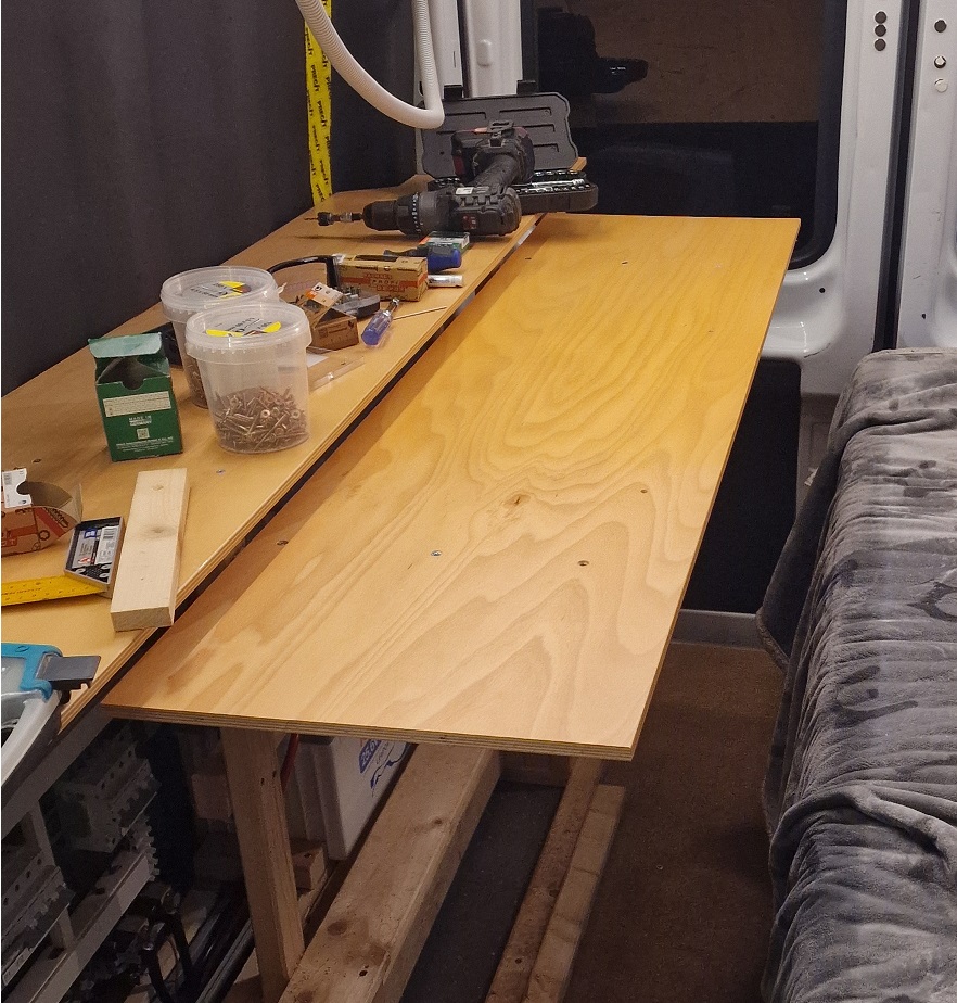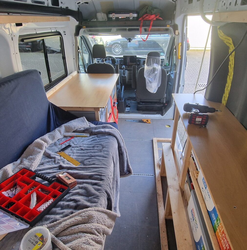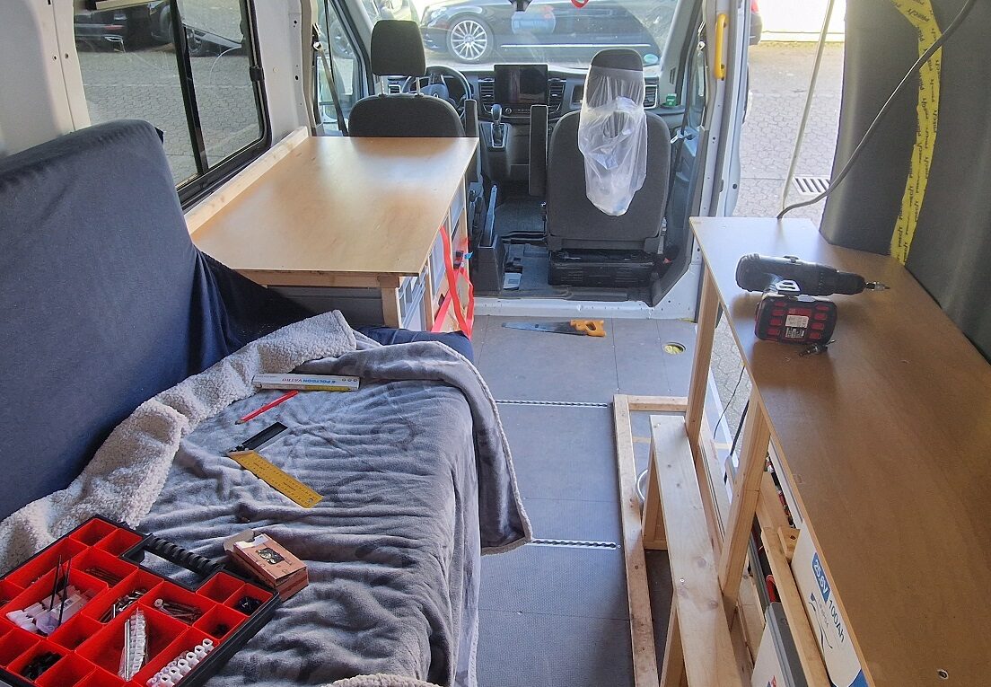 „Oberflächen zum Dingedraufstellen“ hört sich erst mal banal an – bei meiner letzten Tour an die Mosel habe ich aber festgestellt, dass es schon ziemlich nervig ist, wenn man keinen Tisch hat um einen Teller oder einen Becher abzustellen. Da es schnell gehen muss, haben wir also etwas „Restholz“ zurechtgeschnitten und auf den Küchenblock und den Schrank gegenüber vom Bett geschraubt. Und weil ich gerade im Flow war, direkt noch einen Klapptisch gebastelt und ergänzt 🙂